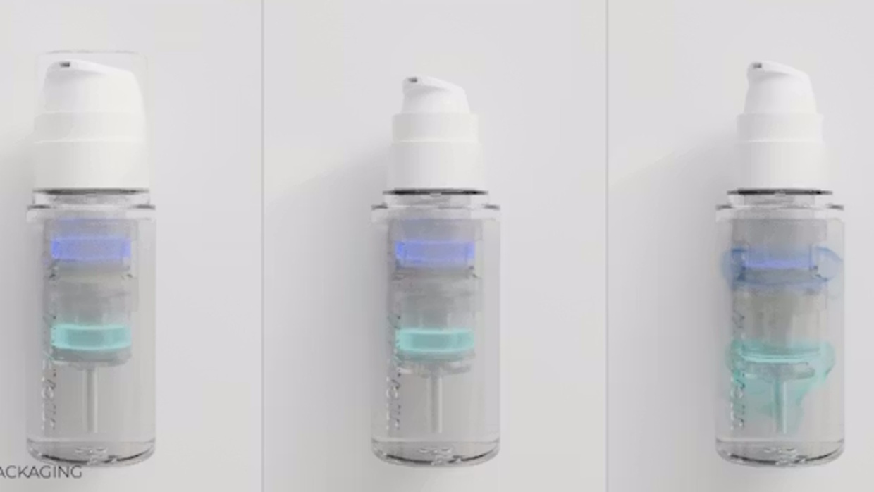 The Triple-Mix Bottle can hold three separately stored formulations in a single bottle. Two sealed inner chambers are suspended inside the bottle body and are only opened when the pump is activated. This means that the respective ingredients in the sealed inner chambers are only mixed together immediately before use. This keeps the components separate until they are used. This is intended to maintain stability and freshness and enable simple, even dosing.