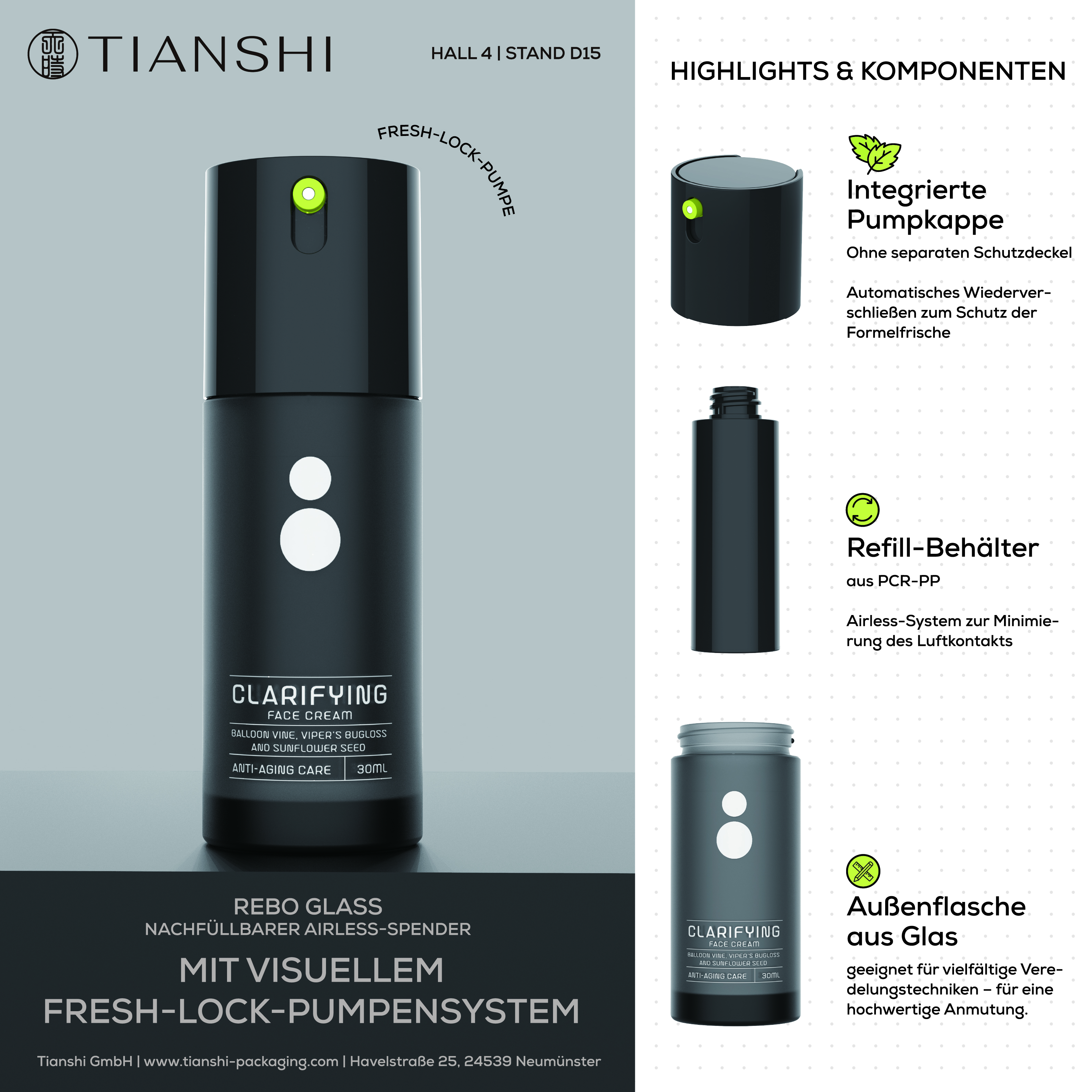 The Fresh-Lock pump with an integrated pump cap enables hygienic and controlled dispensing without the need for a separate protective lid. After each dose, the system automatically reseals to protect the formulation from air exposure and contamination. Fewer components ensure a clean appearance and an improved user experience. Ideal for high-end skincare products requiring freshness, stability, and intelligent packaging solutions.